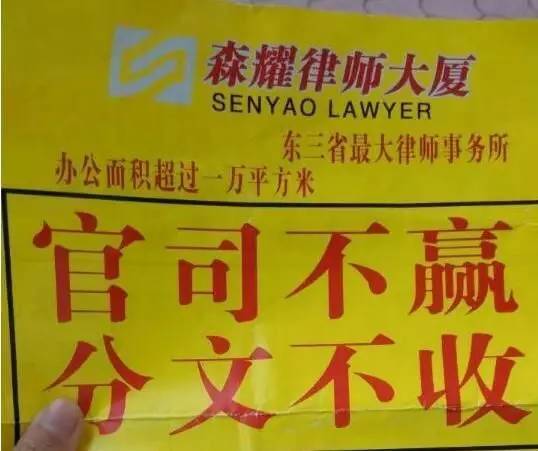 黑龙江森耀律师事务所是一家合伙制律师事务所,2015年起,便通过巨型户外广告、电视和报纸广告对外宣称:官司不赢,分文不收。同时,该所还聘请黑龙江电视台著名节目《新闻夜航》主持人为其拍摄广告进行宣传。被认定为涉嫌刑事犯罪,公安机关登记在册的受害者有5000多人,此案涉案人员90人,38人被起诉。